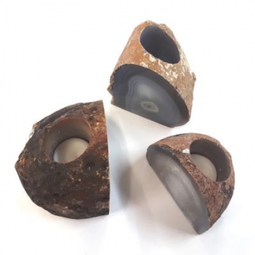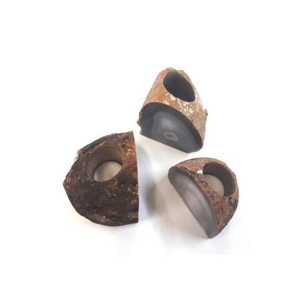 O produktu: Svícen vyrobený z kusu achátu, který byl z přední strany seříznutý a vyleštěný. Uprostřed je vyvrtaná díra pro umístění čajové svíčky, zespodu je nalepena tenká hebká podložka, jenž brání poškození povrchu. Výška svícnů se pohybuje zhruba mezi 7 až 11 cm. Uvedená cena je za 1 kus.