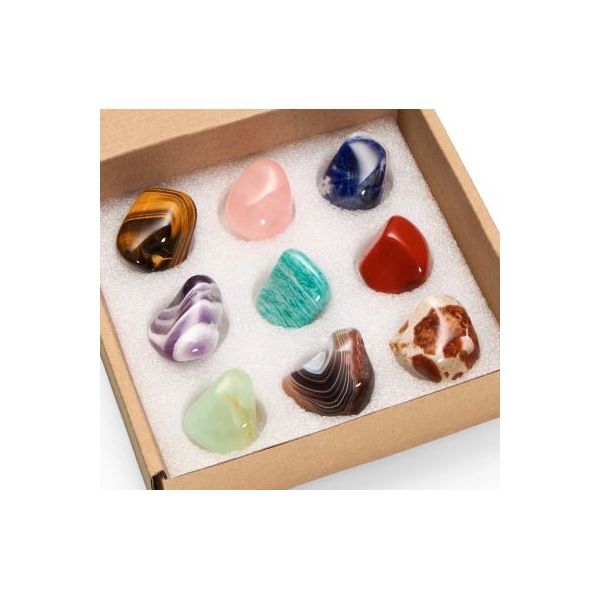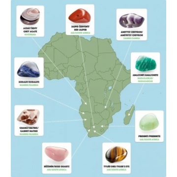 Unikátní zeměpisná sbírka AFRIKA s devíti tromlovanými kameny vel. XL. Každý z kamenů pochází z jiné části afrického kontinentu - názvy, popisy i lokace jsou uvedeny na webové stránce, na kterou se zákazníci dostanou po načtení QR kódu na krabičce.Zde najdete veškeré informace,včetně mapy Afriky s jednotlivými lokacemi.