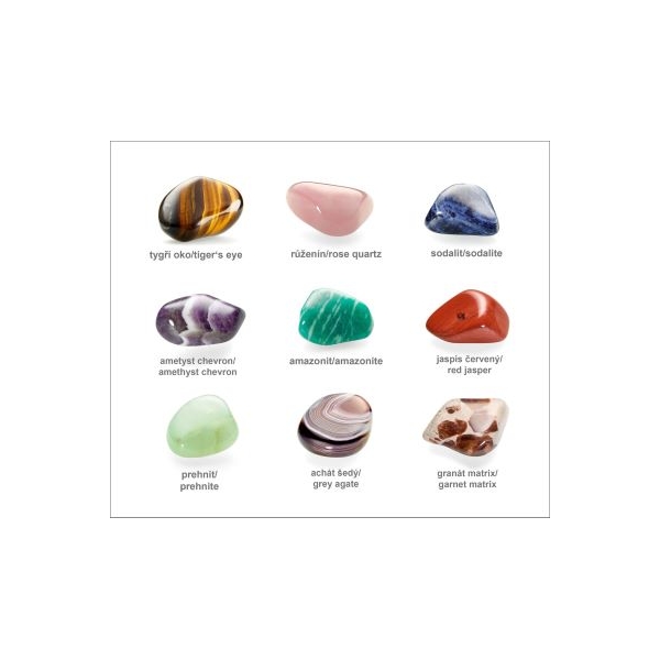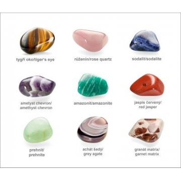 V sadě najdete tyto oblíbené druhy kamenů: tygří oko, růženín, sodalit, ametyst chevron, amazonit, jaspis červený, prehnit, achát šedý a granát matrix.