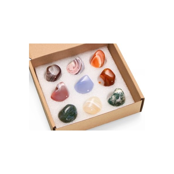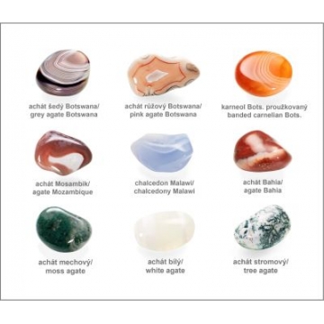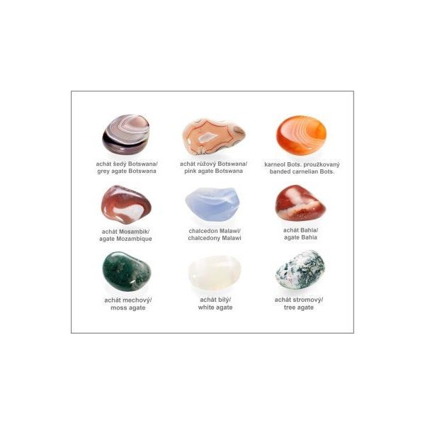 V sadě najdete tyto oblíbené druhy achátů: achát šedý Botswana, achát růžový Botswana, karneol Botswana proužkovaný, achát Mosambik, chalcedon Malawi, achát Bahia, achát mechový, achát bílý a achát stromový.